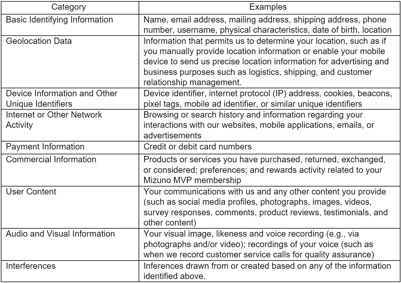 This Privacy Policy describes how Mizuno USA, Inc. and Mizuno Canada Ltd. (collectively, “Mizuno,” “we,” “us,” or “our” as appropriate) collect, use, disclose, and protect your personal information. We are committed to commercially reasonable measures aimed at safeguarding the privacy of individuals who visit our websites (the “Sites”) and those who use our various services, including our mobile applications, or any other services that link to this Privacy Policy. This includes purchases of our products in our stores, online or through third-party partners, in-store visits, interactions with us, engagement on social media, or participation in any of our programs or events (collectively referred to as the “Services”). This Privacy Policy applies to Mizuno’s customer-facing activities in the United States and Canada. Our Sites may contain links to websites and/or applications that are operated and maintained by third parties. This Privacy Policy does not apply to how third parties process your personal information. We recommend that you review the privacy practices of those third parties.